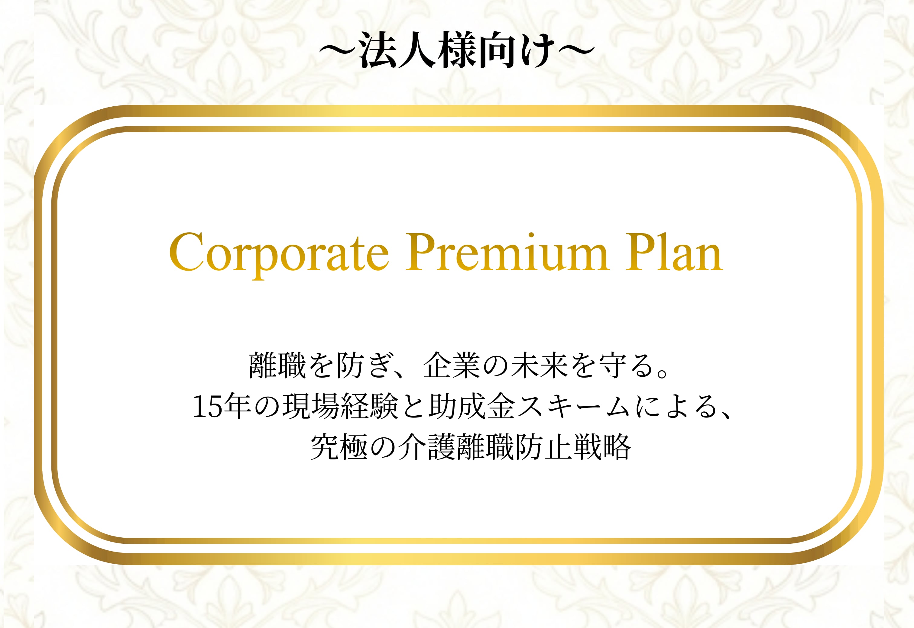 Corporate Premium Plan 離職を防ぎ、企業の未来を守る。 15年の現場経験と助成金スキームによる、 究極の介護離職防止戦略